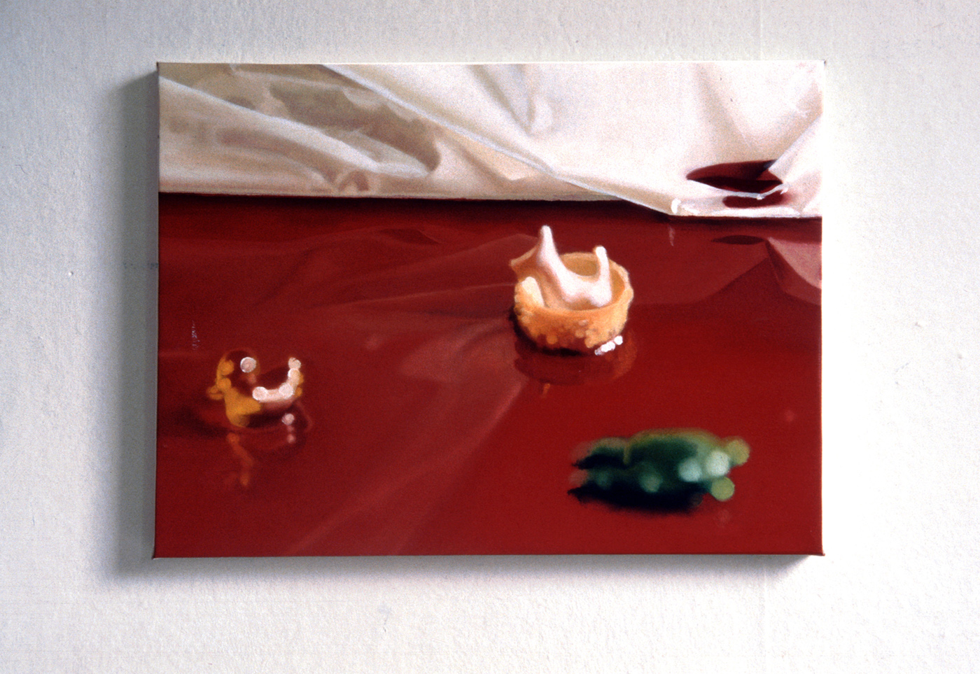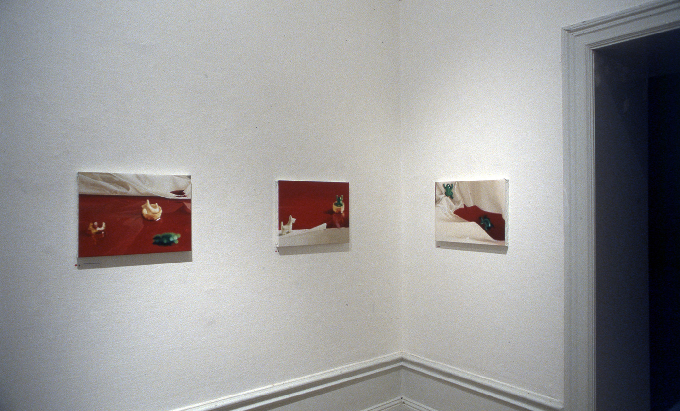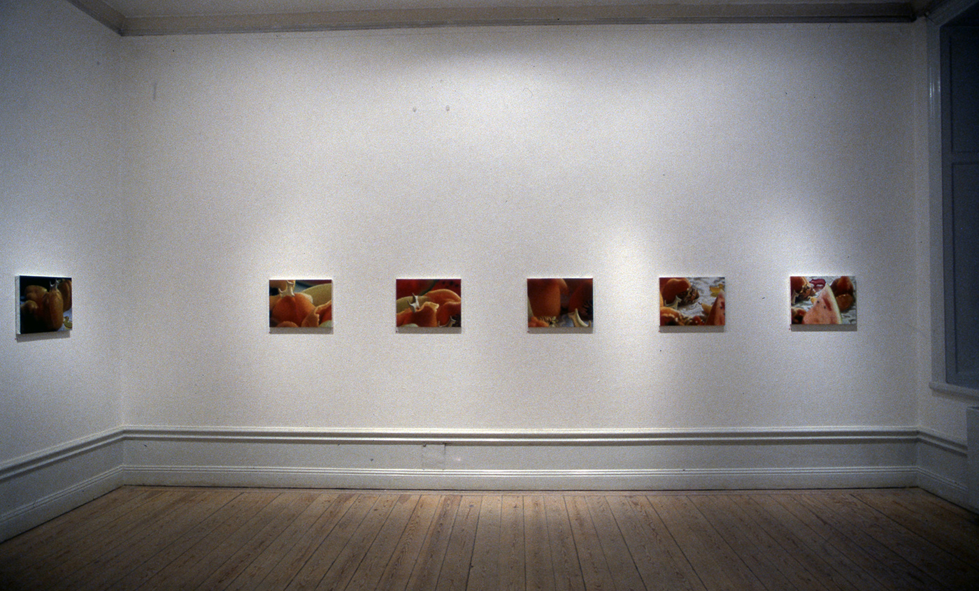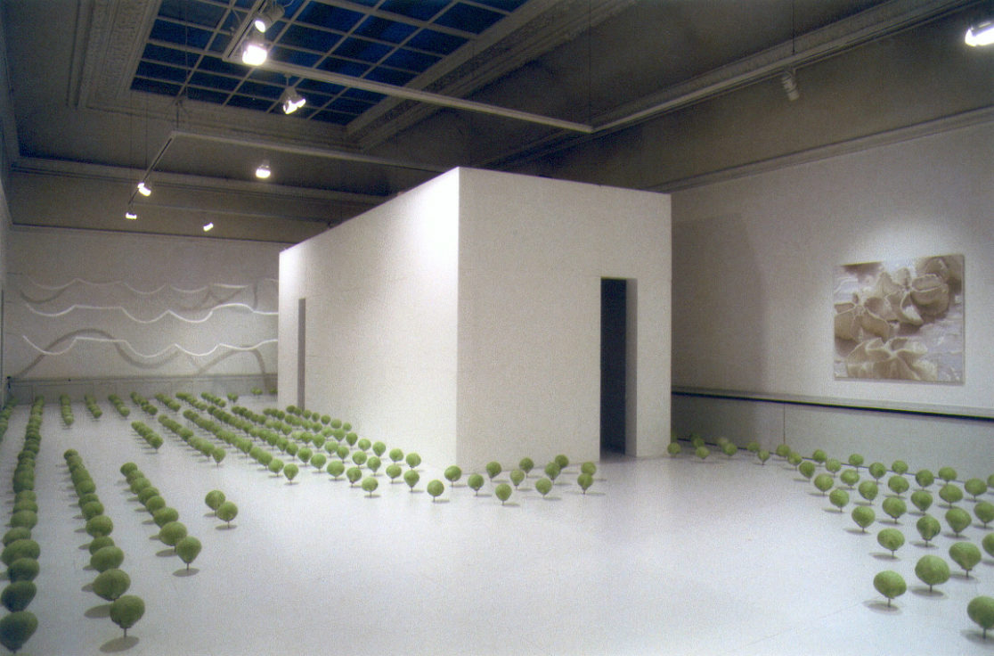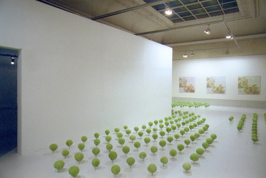 Installationen är hopfogad av flera olika verk: Med huvudet på skaft; 500 verkliga kålhuvuden på pinne i symetriskt mönster, varav ett mindre antal rörliga. Innanför och utanför; på ett sex meter långt bord projiceras förvrängda bilder av djur, ackompanjerat till ljudet av vattendroppar och enstaka skrammel från laboratorieinstrument. Ett antal mindre målningar med motiv på leksaksdjur inbegripna i sociala aktiviteter; bergsklättring, strandliv etc. Stora oljedukar i vitt porträtterande utspritsade gräddklickar. Skulptur med vita ballonger i form av en DNA-Iik kedja.