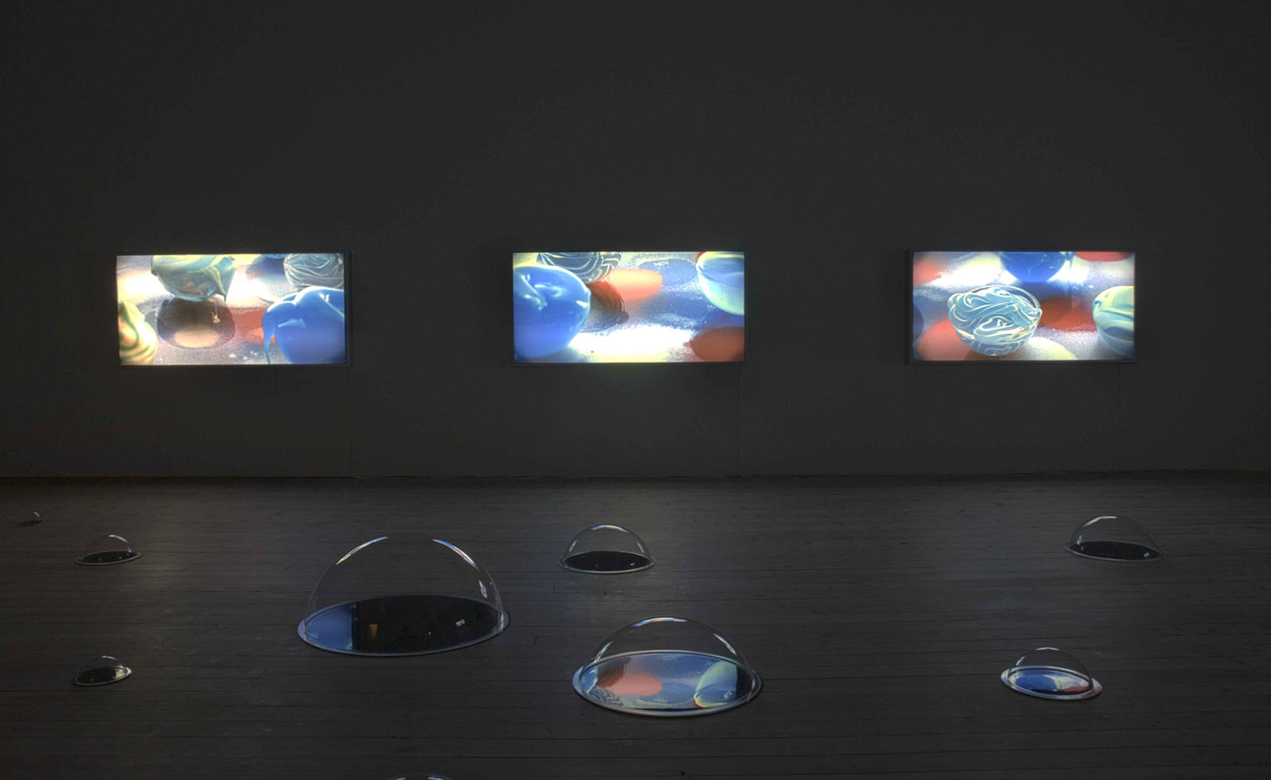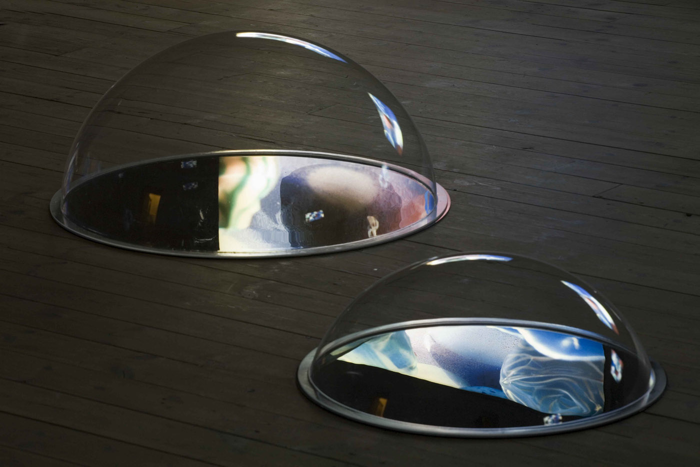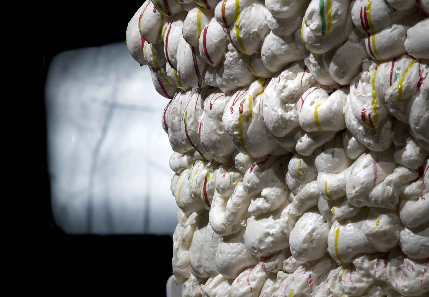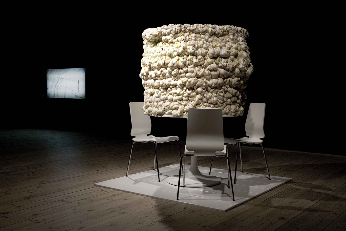 The installations are newly produced and have never before been exhibited. The oversized Spettekaka (a traditional sweet cake from southern Sweden) stands as a reflection of our dreams of fulfilment and longing but can suddenly transform in our minds in to something grotesque and distasteful. The installation Half Full, consisting of gigantic soap bubbles that have fallen to the floor, reflect the immaterial light box images Eye Measurement depicting enlarged candy. Here we find ourselves crossing a minefield of allurements and temptations, and are forced to question our dreams and desires – are they beneficial or not? Have our dreams begun to bite themselves in their tails?