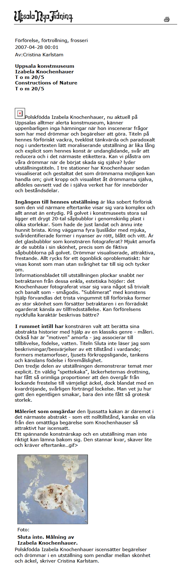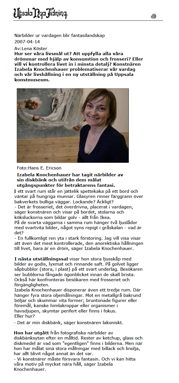 Since graduation from the Royal Academy of Fine Arts in Stockholm, she has worked with painting (often based on photographs), photography, sculpture and installations. In the late 1990s she worked with large paintings in strong colours, often preferring symbolically significant colours such as blue and green and centring on themes such as the macro- and microcosm. The paintings bear a clear tendency of alternating between abstractions and figurative renditions, and a shifting of perspective between the small and the large – all calling upon the viewer’s ability to fantasize and reflect upon the complexities of the micro- and macrocosm. Early on in her career, Izabela Knochenhauer exhibited photographs she had taken with a specialised camera lens, entitled Cross-fertilisations, depicting intensely magnified plant parts with kaleidoscopic effects. She showed how the development of life is dictated by chance, and how evolution is an infinite series of random events. Her art is often characterised by an underlying request to gain insight with regard to our lack of awareness of the ongoing society development process. Do we really know all that we should know in order to make the right decisions about our future?